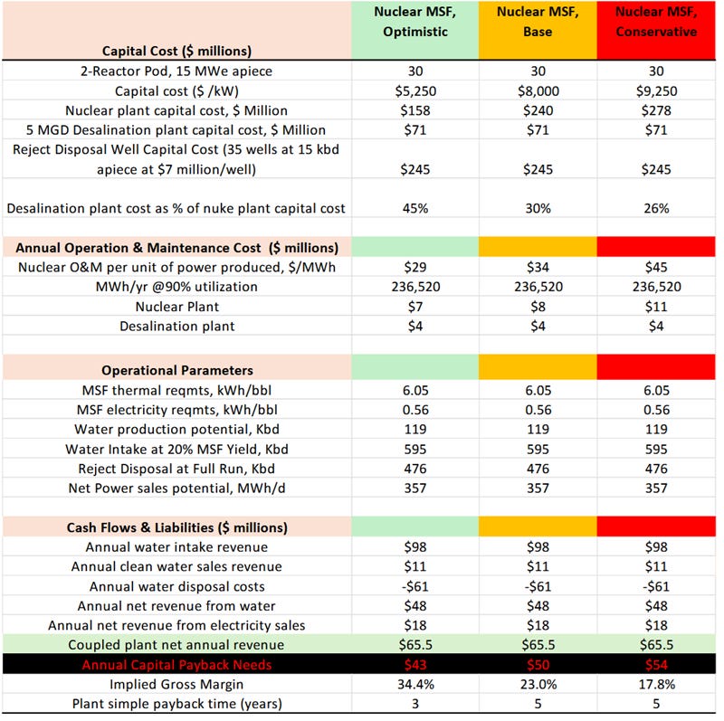Large-scale nuclear desalination isn’t science fiction. From 1973 to 1999, the Soviet Union and Kazakhstan operated the BN-350 sodium-cooled fast reactor near the Caspian Sea. It successfully produced 125 MW of electricity while simultaneously yielding over 500,000 barrels of desalinated water per day. It’s worth noting that at roughly 12,800 mg/l TDS Caspian Sea water is only about 1/3 the salinity of seawater and much less saline than most Permian produced waters. With that in mind, the Aktau project’s 25 years of successful nuclear desalination suggest the concept can work even in remote and demanding locations.